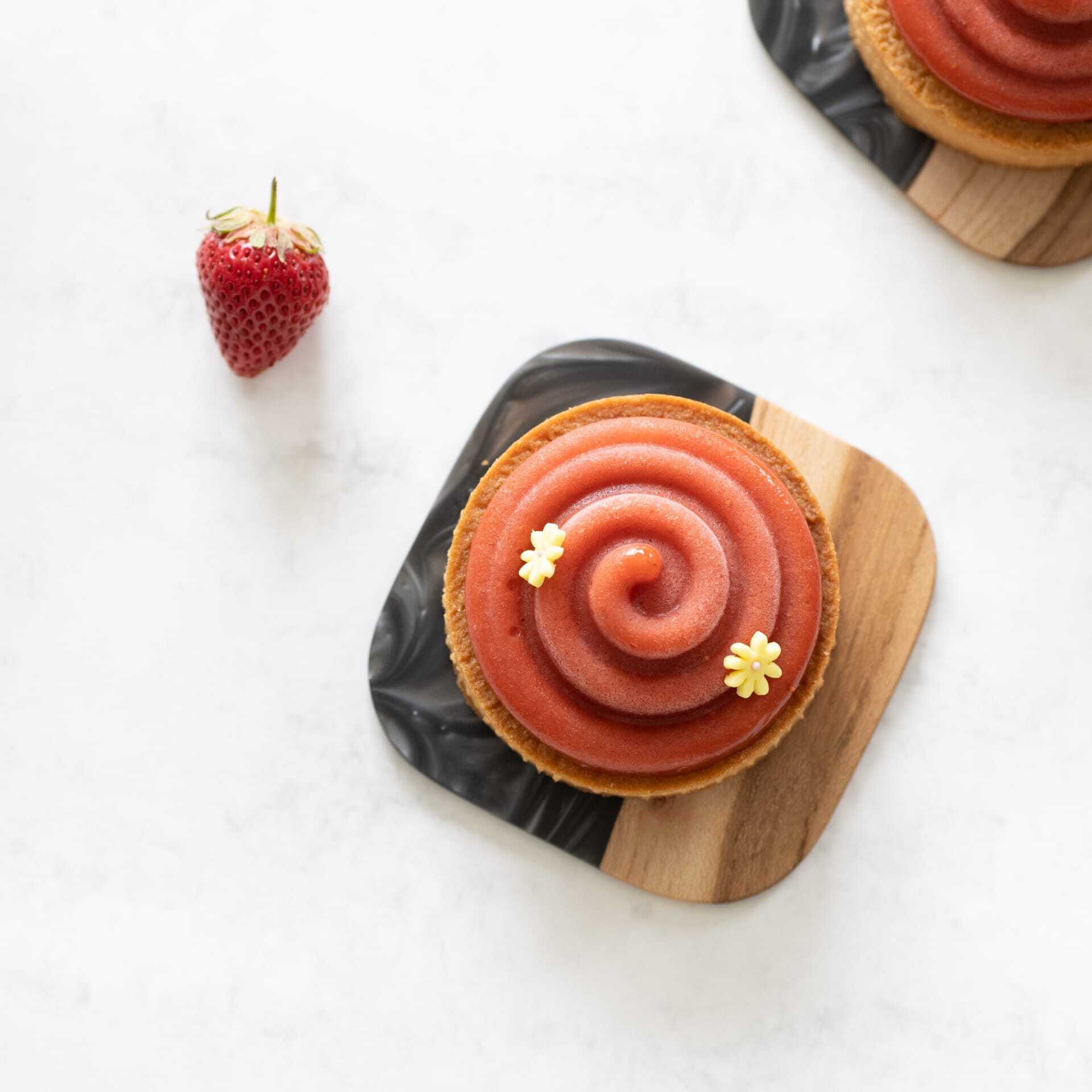 Pochez la crème sur le fond de tarte et ajoutez les fraises.