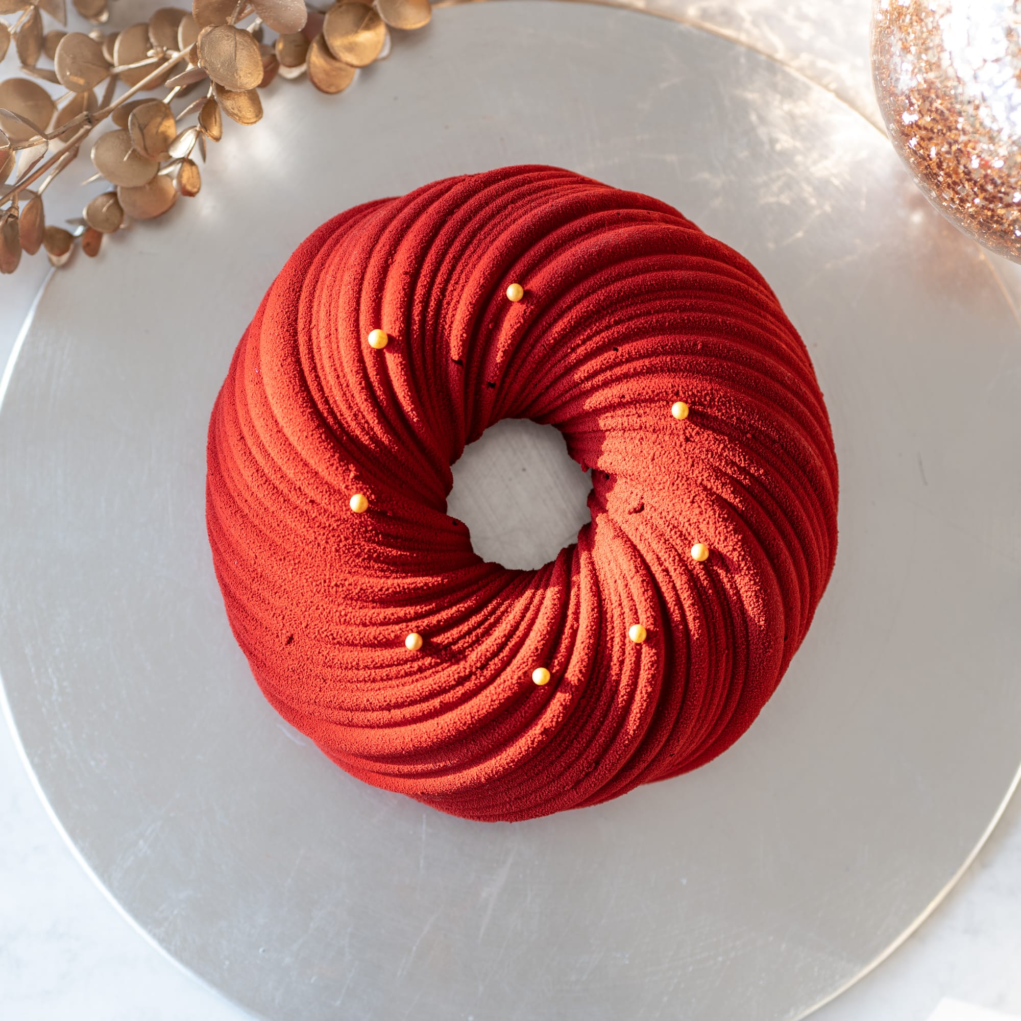 - Démouler l’entremet et le poser sur un verre renversé pour faciliter le flocage.