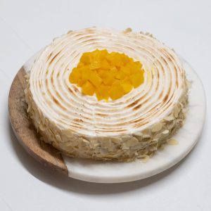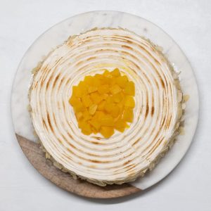 Ce délicieux gâteau se compose d’une génoise légère, d’une crème mousseline onctueuse, d’un sirop d’imbibage parfumé et d’une meringue italienne légèrement dorée. Le tout est couronné de succulents morceaux de pêches. Voici les ingrédients nécessaires :