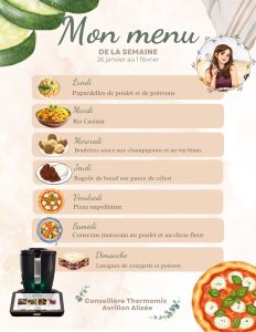 Mon menu de la semaine Inspiration & organisation au quotidien Du 26 septembre au 01 févier Chaque semaine, je vous propose un menu complet, simple et gourmand, pour vous aider à mieux vous organiser, gagner du temps et varier les plaisirs en cuisine grâce à votre Thermomix. L’idée ? Vous...